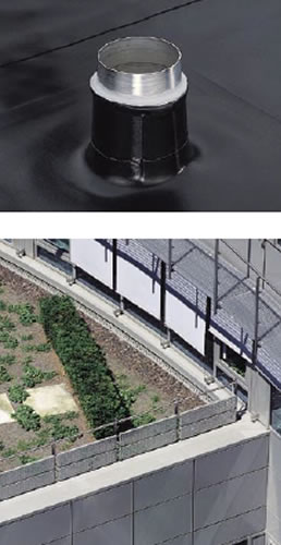 DER OBERBEGRIFF FLACHDACH BEZEICHNET UNTERSCHIEDLICHE Konstruktionsweisen und Materialien. Zur Abdichtung werden Bahnen auf Bitumen- oder Kunststoffbasis sowie Flüssigabdichtungen verwendet. Die Konstruktion bestimmt die Funktion Beim belüfteten Dach bleibt zwischen Dachdichtungsträger und Wärmedämmschicht ein Luftraum zur Be- und Entlüftung. Beim nichtbelüfteten Dach liegt dagegen direkt über der Wärmedämmschicht eine witterungsbeständige Dachabdichtung. Diese Bauweise bewirkt zum Beispiel eine unterschiedliche Belastungsfähigkeit. Vielseitig in der Gestaltung Beim klassischen Flachdach liegt die Abdichtung direkt unter einer Schutzschicht, die meist aus Kies oder Wärmedämmplatten besteht. Das Dichtungsmaterial muss witterungsfest sein und zudem der Mikrobenbelastung standhalten. über ihre eigentliche Funktion hinaus eröffnen Flachdächer auch neue gestalterische Perspektiven. Beim freibewitterten Dach liegt die Abdichtung als oberste Schicht auf. Diese muss längst nicht mehr zwangsläufig schwarz oder weiß sein. Mit modernen farbigen Werkstoffen lassen sich auf einfache Weise wirkungsvolle Akzente setzen. Bei der Abdichtung ist vor allem Stabilität gegen mechanische und thermische Belastungen gefragt.